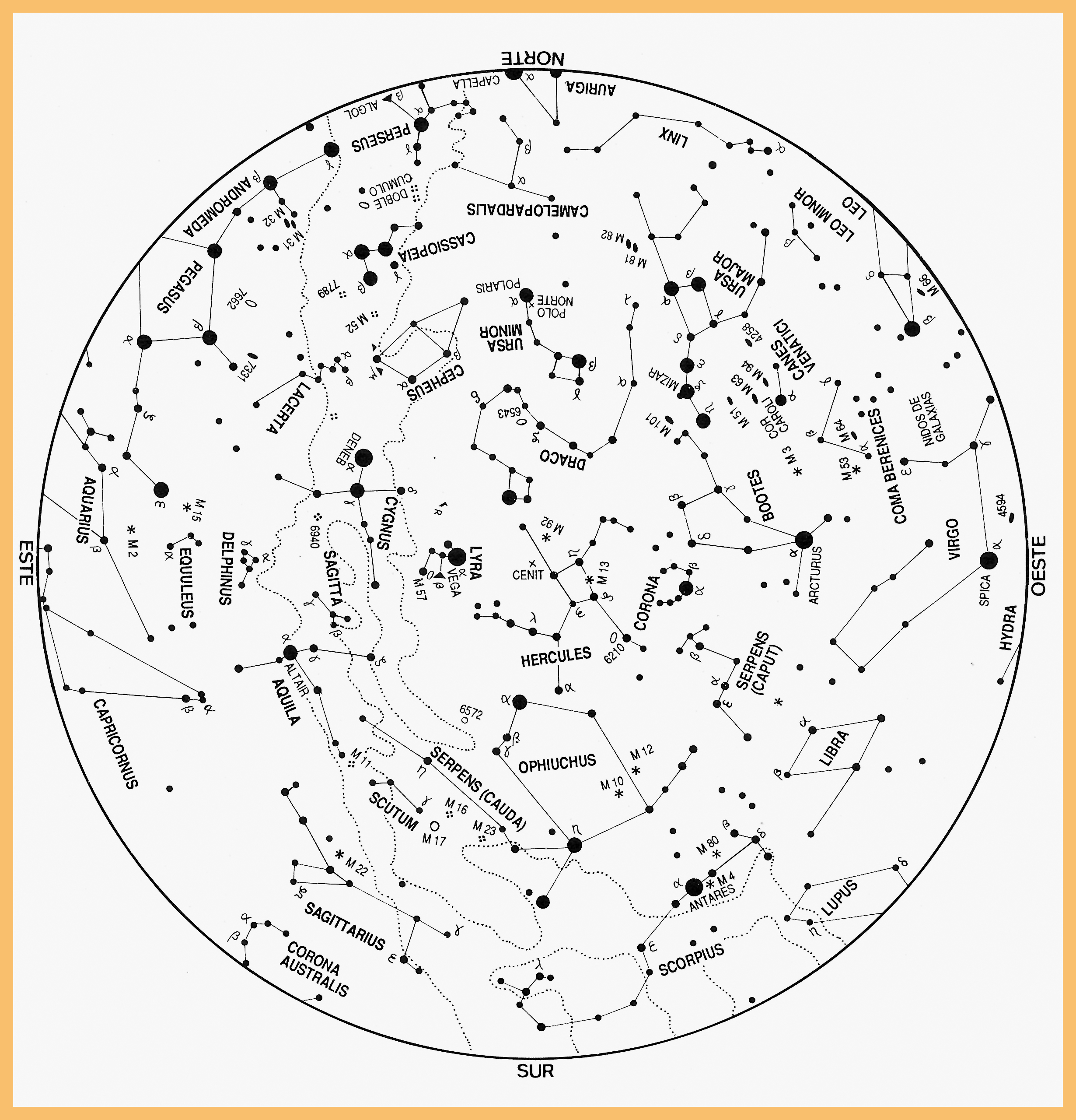 Utilizaremos un mapa del cielo donde se sitúan las estrellas y las líneas que unen de forma arbitraria las estrellas (sí, arbitraria según las diferentes mitologías de los antiguos griegos y romanos en nuestro caso) e, incluso, las arbitrarias líneas de «fronteras» entre constelaciones (asignadas por la Unión Astronómica Internacional a principios del siglo XX; antes de esta fecha, sencillamente, no existían), y, a partir de ahí, vamos a reconocer esos asterismos en el globo celeste. ¿Difícil?