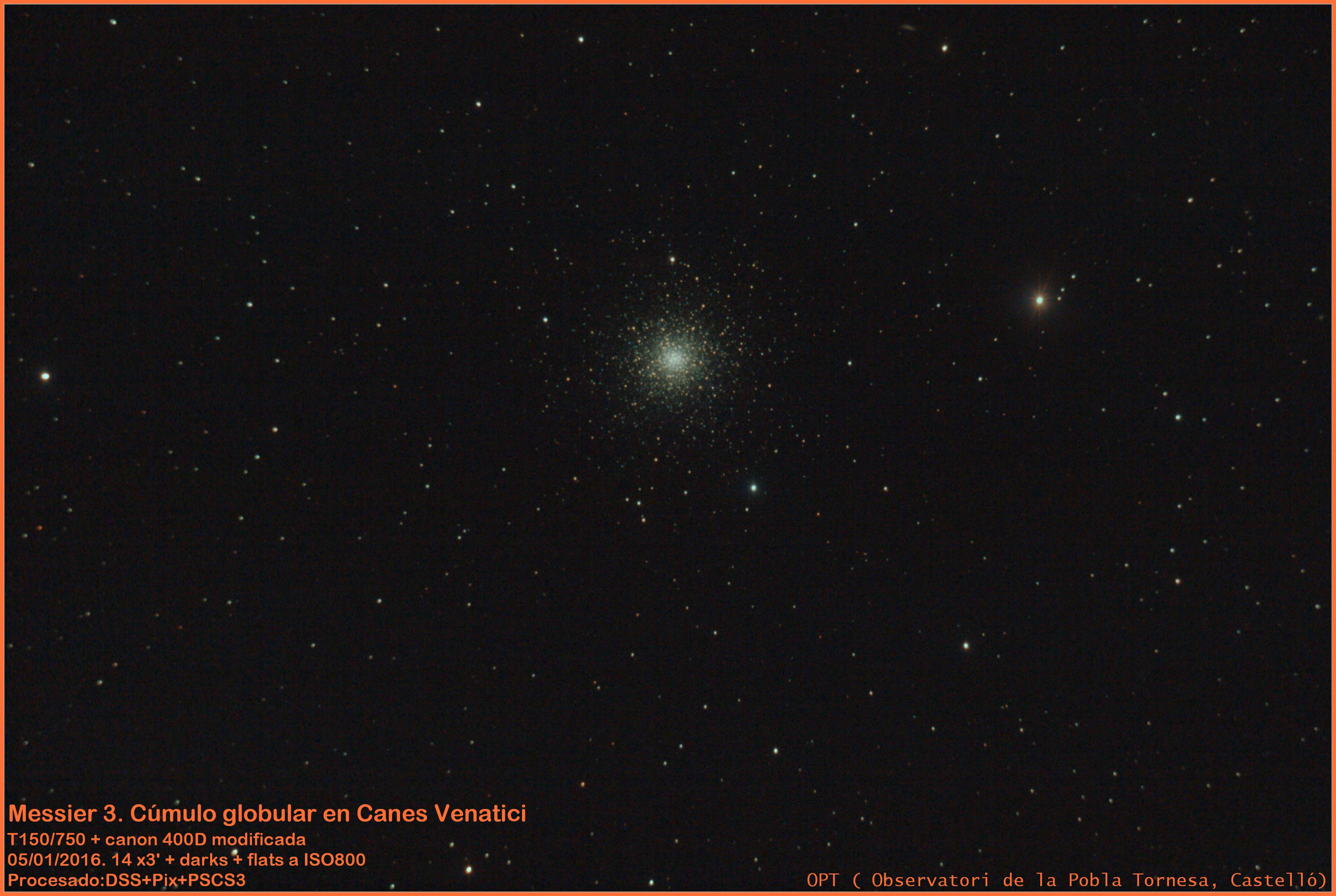 En ese momento, me doy cuenta de que un gran número de objetos Messier están a tiro, muchos de ellos aún sin capturar por mi modesto 15 cm. Un poco más al norte de Catalina, tengo al precioso cúmulo globular M3, al que inmortalizo con 15 exposiciones de tres minutos. Los globulares son agradecidos y, con exposiciones cortas, se muestran con gran esplendor. Pero, además, también son objetos agradecidos de observar en visual, que no nos deberíamos de perder. No me viene a la cabeza ningún globular que no merezca la pena y, si alguno lo parece, es porque el cielo no es el adecuado para él.