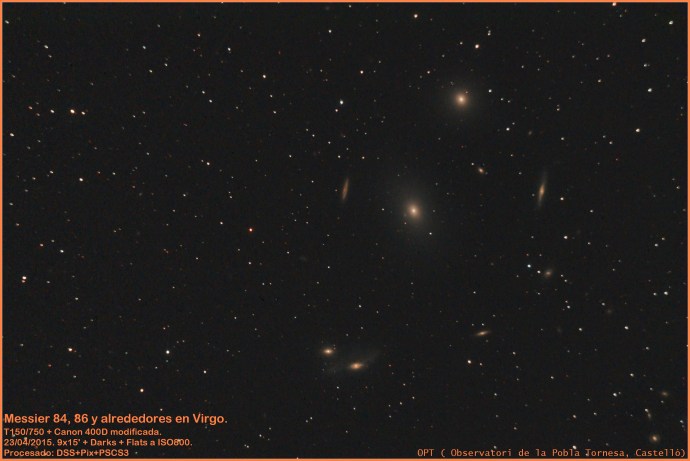 El resultado es la imagen que hay a continuación. El campo es muy rico en galaxias, dominadas por M84 y M86. Destaca la belleza de las cercanas NGC4388 y NGC4402, pero forman parte de la Cadena de Markarian las dos Messier mencionadas, la pareja NGC4438-NGC4435 (a las que se les denomina habitualmente «los ojos») y la pareja NGC4461-NGC4458. Existen dos más que quedarán fuera del campo (por poco), a la derecha de las últimas. Todas ellas presentan unas velocidades y distancias que parecen vincularlas gravitatoriamente, además de su disposición formando una especie de cadena peculiar.
