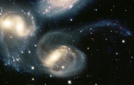 En la imagen presentada en esta entrada, dominada por una preciosa galaxia espiral en la parte inferior de la misma, vemos un pequeño agrupamiento de lejanas galaxias. Este grupo denominado «de tipo compacto» e identificado por E. Stephan –principalmente dedicado a la búsqueda de nebulosas débiles desde el observatorio de Marsella en 1877- , no es producto de la perspectiva espacial desde la Tierra, no al menos en 4 de los 5 componentes del grupo.