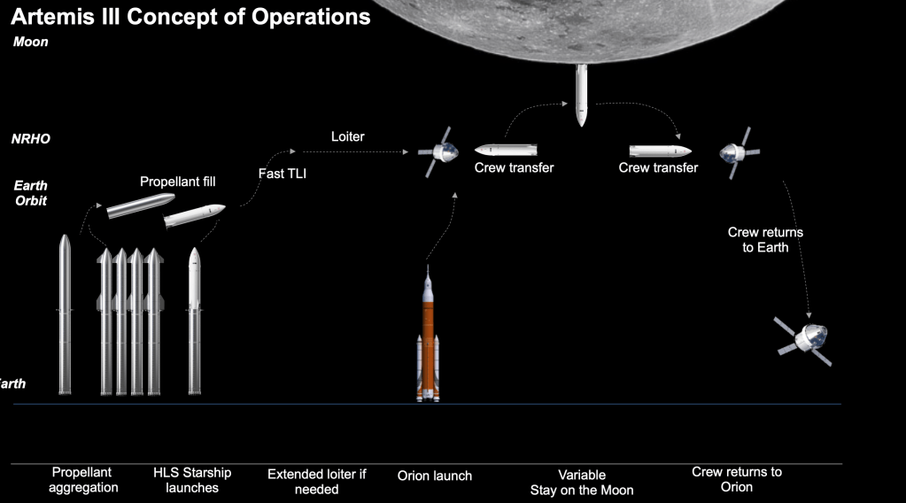 En realidad, el programa Artemisa implica a empresas y organismos de más de 20 países directamente, y tiene un fuerte vinculo con la empresa de Elon Musk, Space X. Recordemos que esta configuración del programa Artemisa – a diferencia de las misiones Apolo- subcontrata un módulo de descenso lunar, que estará en órbita de nuestro satélite esperando a la cápsula Orión para realizar el descenso a la superficie de la tripulación. En órbita lunar por tanto existirá un encuentro Orión-«Moonship», siendo la segunda la encargada de realizar el alunizaje, posterior despegue y reencuentro orbital. Orión, tras recuperar a la tripulación lunar, pondrá rumbo a casa amerizando en el océano pacifico.