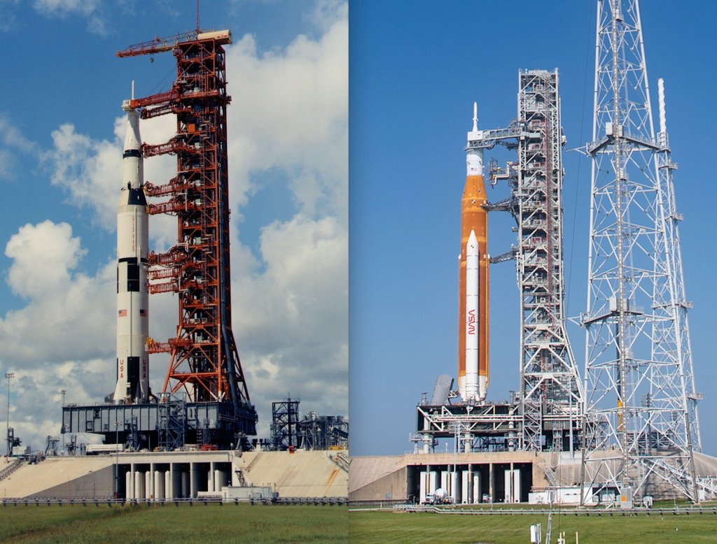 Saturno V (Apolo) versus SLS (Artemisa). 50 años de distancia. Crédito: NASA