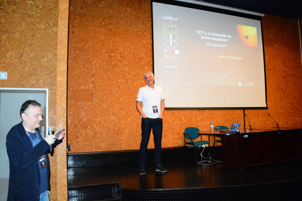 Después contamos con la conferencia del Dr. Héctor Socas, investigador científico en el Instituto de Astrofísica de Canarias IAC, director del Museo de la Ciencia y el Cosmos de Tenerife y creador del podcast Coffee Break: Señal y Ruido. Este podcast fue galardonado el año pasado con el «premio de la audiencia» de la Asociación de Escuchantes de Podcasts y con el Premio iVoox a mejor podcast en categoría de ciencia. Es autor de investigaciones y artículos científicos sobre búsqueda de tecnomarcadores y fue invitado a la reunión organizada por la NASA en 2018 «NASA and the search for technosignatures» para recabar asesoramiento de expertos en este tema.