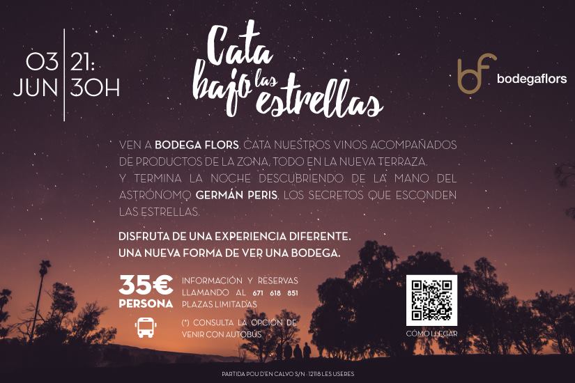 Virnes 3 de junio :Vino y Estrellas 2016, con Bodega Flors. Este año, además de los buenos caldos de Vicente Flors acompañados de productos típicos de la tierra, en el magnífico entorno de las Bodegas Flors de Les Useres (Castellón), posteriormente tendremos una interpretación del cielo muy peculiar, vinculando las constelaciones a la cultura del vino, para pasar a identificar en el cielo a Júpiter, Marte y Saturno y que observaremos de cerca con un potente telescopio. ¿Se te ocurre un mejor plan para el viernes 3 de junio?. Reservas 671 618 851