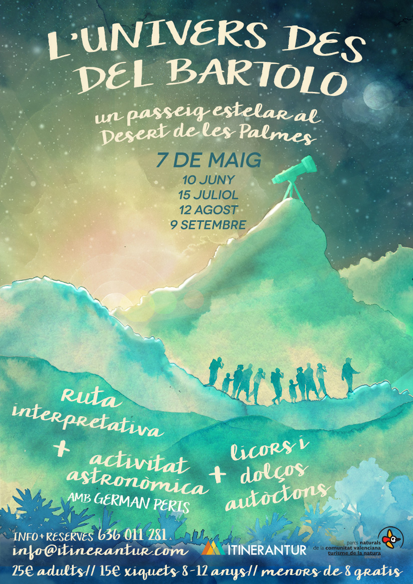 Sábado 07 de mayo: «El universo desde el Bartolo» con ITINERANTUR en el Desert de les Palmes (Benicàssim). La primera de las Rutas interpretativas naturales de la mano de los profesionales de Itinerantur, con una noche de estrellas en la misma cima del monte Bartolo, acompañado de dulces y licores autóctonos de la zona. Para todos los públicos. Información y reservas:636 011 281.