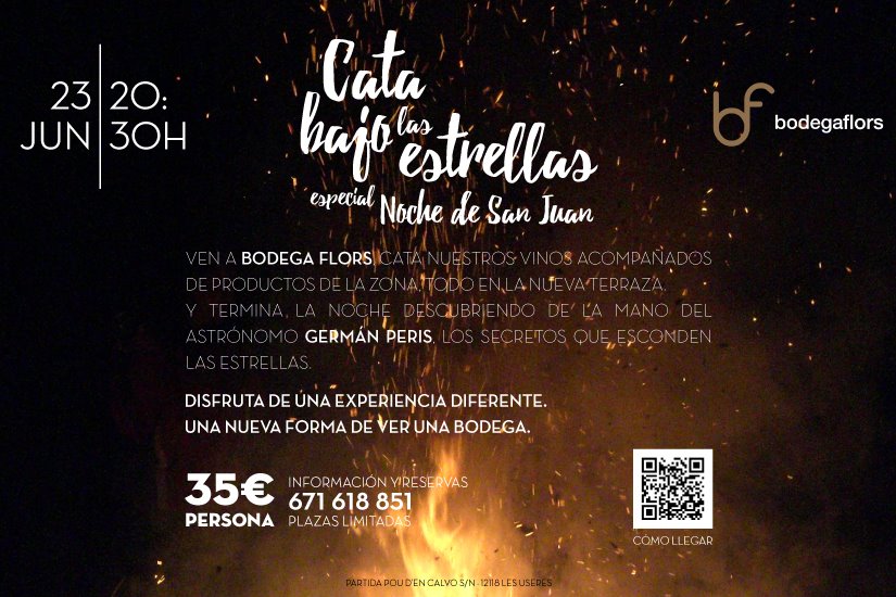 Jueves 23 de junio : Nit de Sant Joan. Vino y Estrellas 2016, con Bodega Flors Este año, además de los buenos caldos de Vicente Flors acompañados de productos típicos de la tierra, en el magnífico entorno de las Bodegas Flors de Les Useres (Castellón), tendremos una interpretación del cielo muy peculiar, vinculando las constelaciones a la cultura del vino, para pasar a identificar en el cielo a Júpiter, Marte y Saturno y que observaremos de cerca con un potente telescopio. ¿Se te ocurre un mejor plan para pasar la noche mágica de Sant Joan?. Reservas 671 618 851.