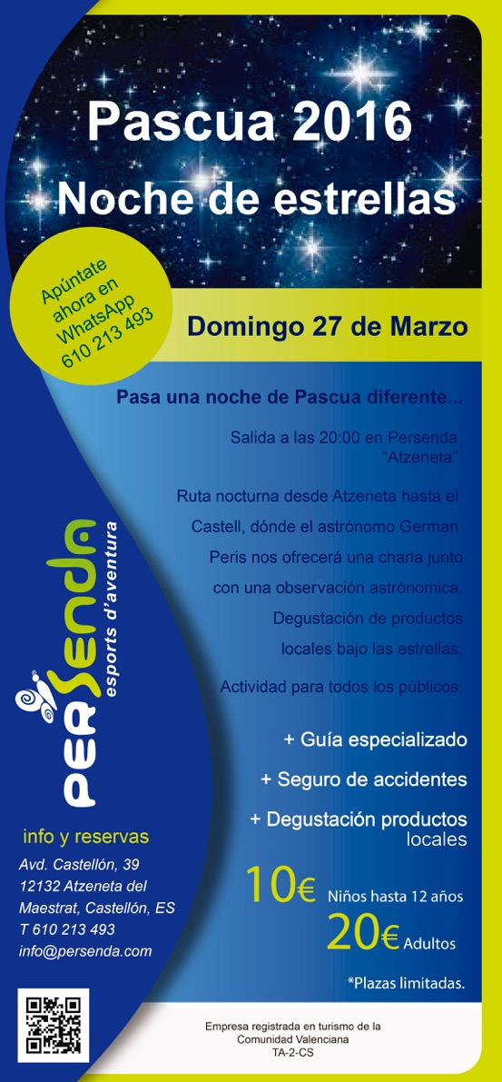 27 de marzo. «Noche de estrellas en Atzeneta con PERSENDA». Ruta vespertina/nocturna desde la población de Atzeneta del Maestrat por un guía especializado de PERSENDA, hasta el castillo de la localidad. Allí, degustación de productos típicos e interpretación del cielo, con observación astronómica. El cielo de primavera y el planeta Júpiter.