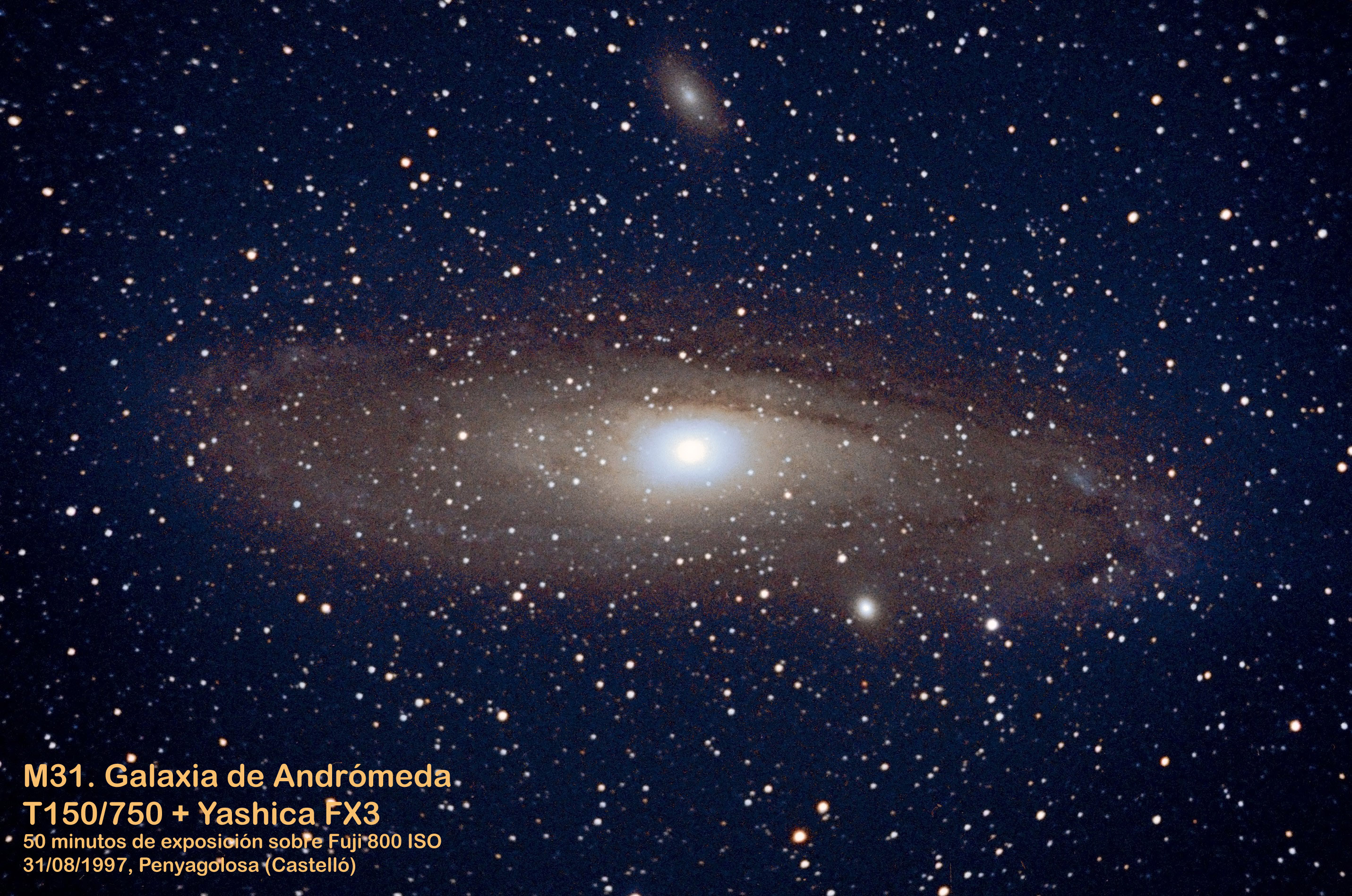 Un buen número de años haciendo esto, casi fotografía artesanal del cielo, y que culminaron con varios premios de astrofotografía, aunque solo voy a mencionar el de 1999 en el I Concurso Internacional de Imagen Astronómica de Canarias, por el que recibí un segundo premio en la categoría de focales largas, por una imagen de la galaxia de Andrómeda (M31) con una exposición de 50 minutos a 800 ISO desde el macizo del Penyagolosa, donde todas las lunas nuevas del verano me escapaba durante unas cuantas noches.