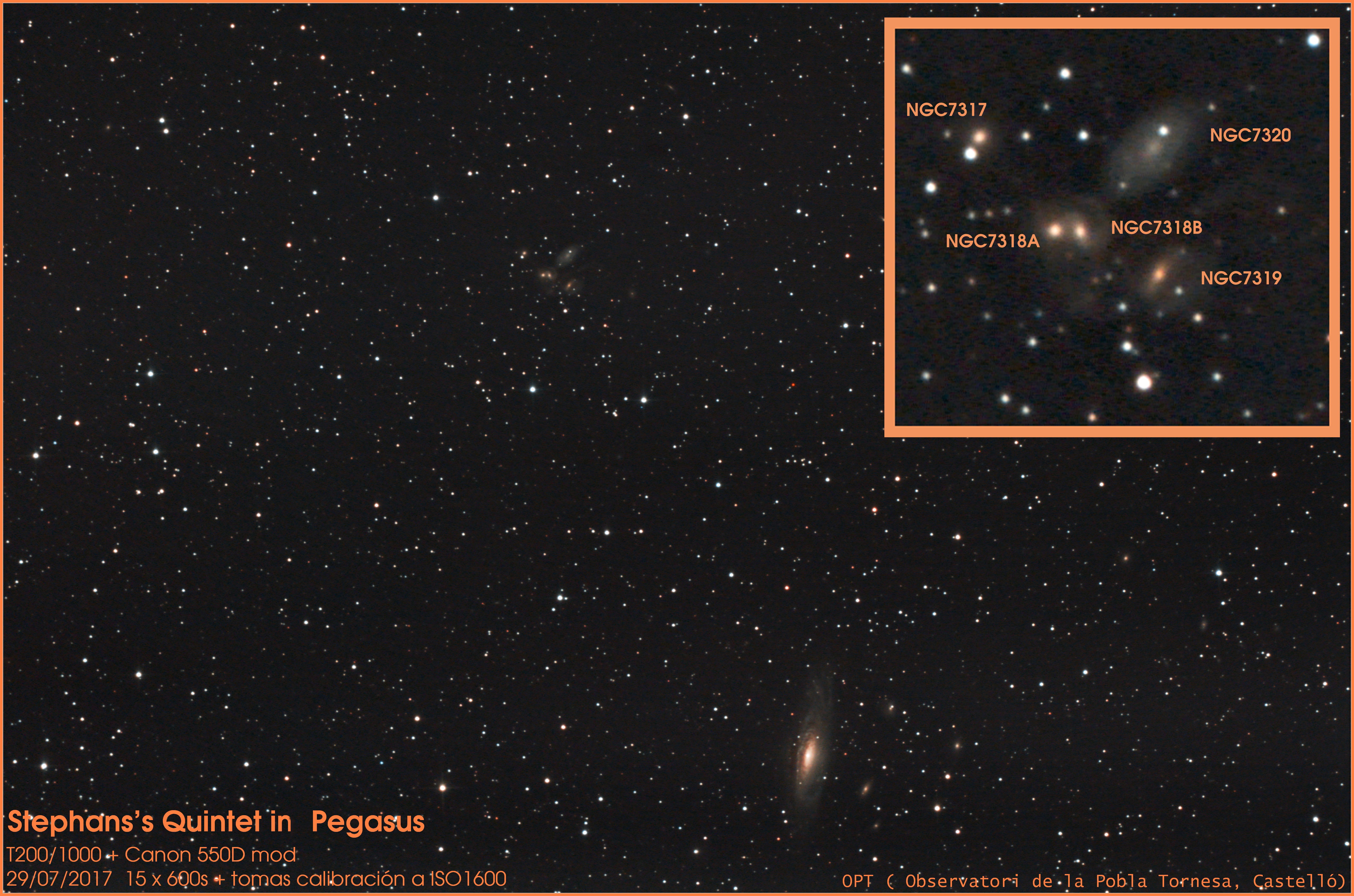 En la imagen presentada en esta entrada, dominada por una preciosa galaxia espiral en la parte inferior de la misma, vemos un pequeño agrupamiento de lejanas galaxias. Este grupo denominado «de tipo compacto» e identificado por E. Stephan –principalmente dedicado a la búsqueda de nebulosas débiles desde el observatorio de Marsella en 1877- , no es producto de la perspectiva espacial desde la Tierra, no al menos en 4 de los 5 componentes del grupo.