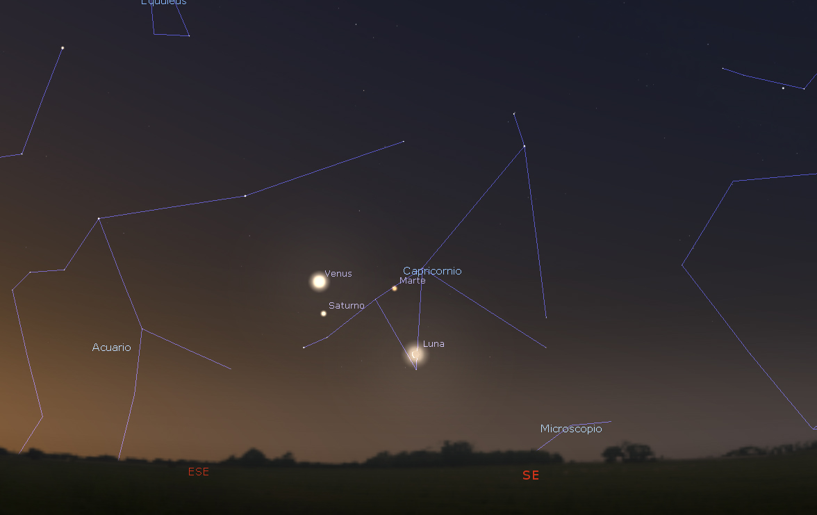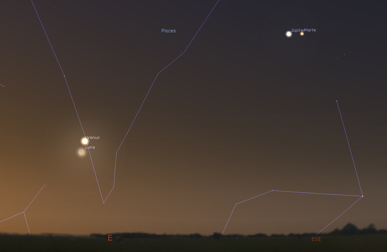 En la madrugada del 28 de marzo tendremos una interesante conjunción de Venus (el más brillante), Saturno y Marte, no muy lejanos a una fina Luna menguante y poco antes de las luces del alba.