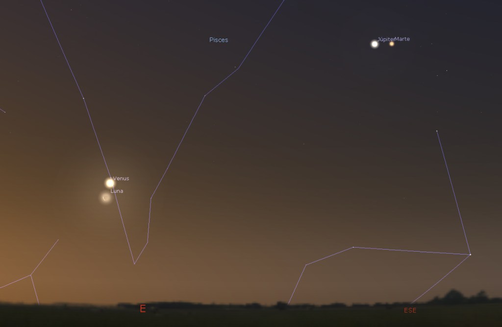 Durante las madrugadas del mes de abril, con un horizonte Este Sureste muy despejado de obstáculos, podremos observar 4 de los 5 planetas visibles a simple vista, con Júpiter, Venus, Marte y Saturno en casi una línea recta y enumerados en sentido ascendente. Hacía finales de ese mes la fina Luna menguante cobrará protagonismo cerca de la alineación planetaria, que será más cercana especialmente entre Venus y Júpiter, que alcanzarán una mínima distancia la madrugada del 1 de mayo.